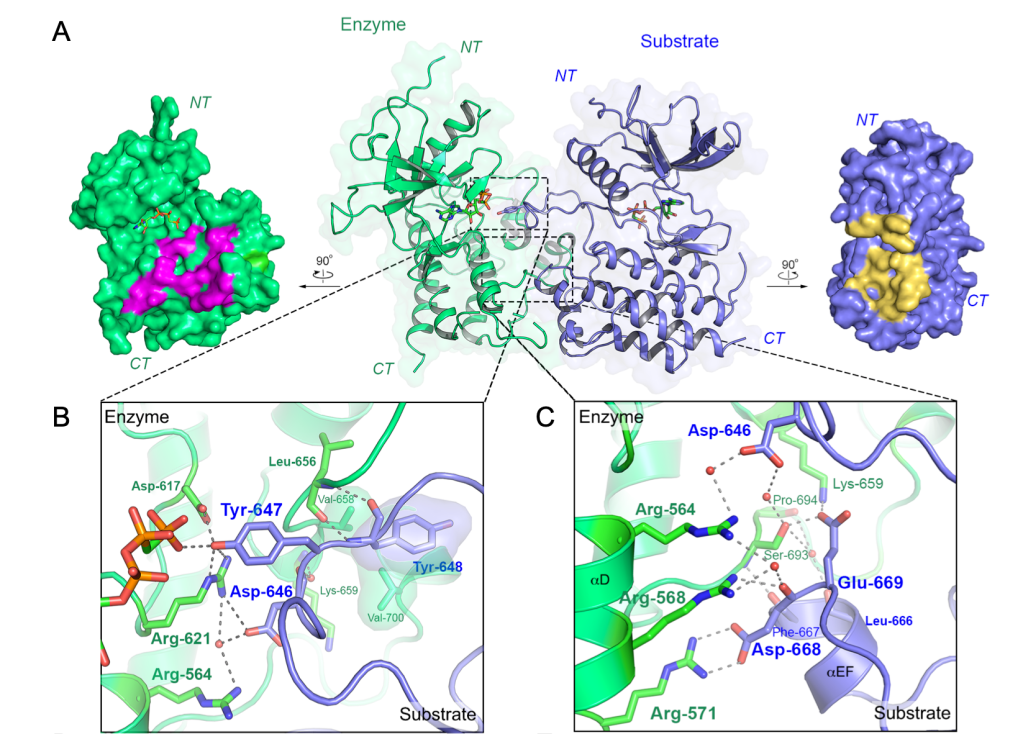 Figure 3. Crystallographic snapshot of an A-loop-transphosphorylating asymmetric complex of FGFR3 kinases. a, Center, overall view of the crystal structure of the FGFR3KR669E asymmetric complex shown as a cartoon superimposed on a semitransparent surface. Enzyme- and substrate-acting kinases are in green and blue, respectively. Bound AMP-PCP molecules are shown as sticks. Left and right, surface regions mediating asymmetric complex formation are highlighted in magenta (enzyme) and yellow (substrate), respectively. b, Close-up view of contacts at the enzyme’s catalytic site. c, Expanded views of the dimer interface distal to the active site showing multiple hydrogen bonding interactions.